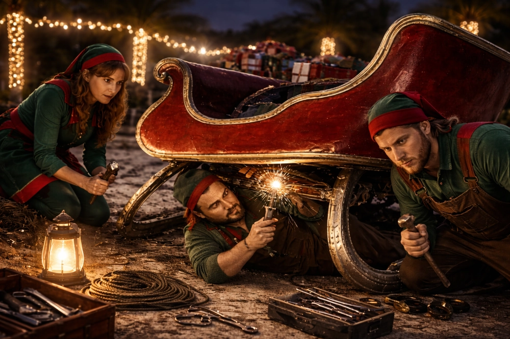 Jak noc pokračuje, v okolí panuje zvláštní klid. Světla saní zůstávají zhasnutá, hvězdy svítí a mezi palmami se nese tiché cinkání nářadí. Vánoční zázrak je zatím v opravě — a zdá se, že si dává na čas.