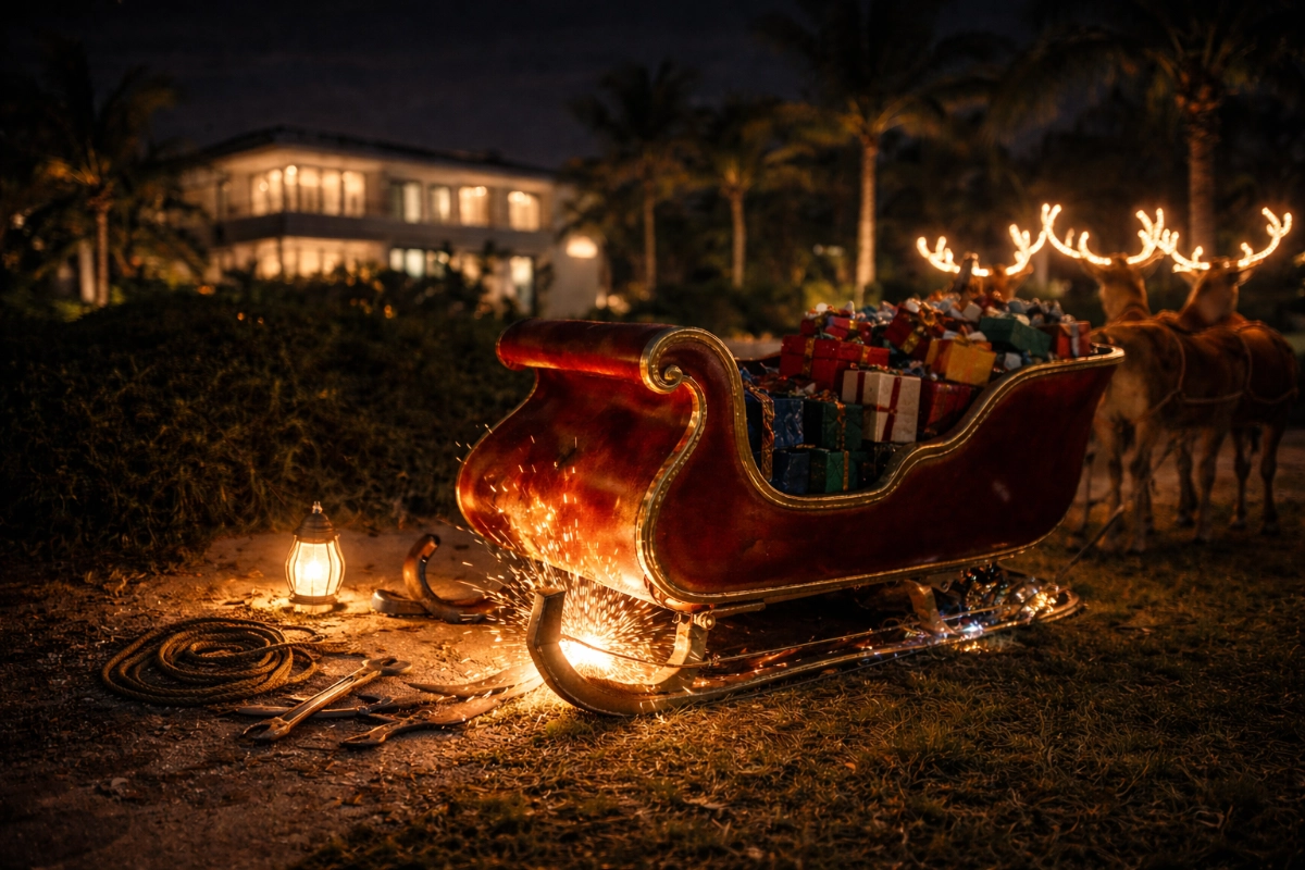 Jupiter Island (Florida) – Nouzové přistání Ježíškových saní nedaleko luxusní rezidence světoznámého golfisty se mělo stát jen krátkou epizodou vánoční noci. Jak se ale ukazuje, technická závada je vážnější, než se původně zdálo, a oprava se i přes veškeré úsilí zatím nedaří.